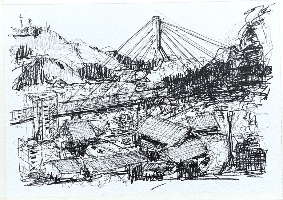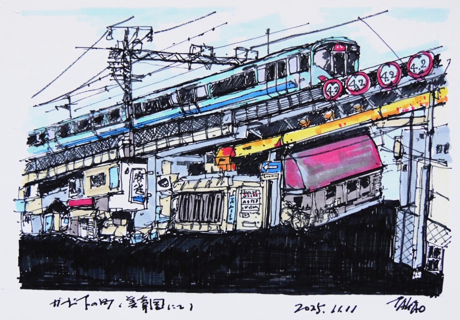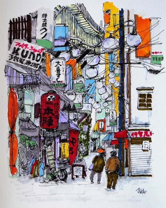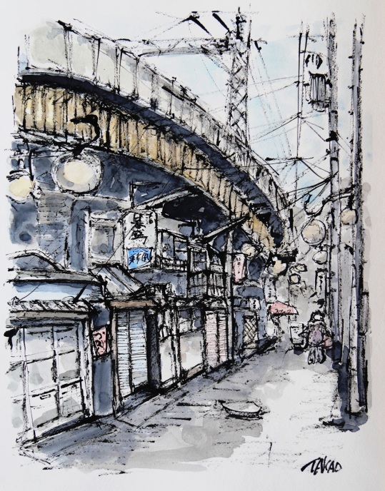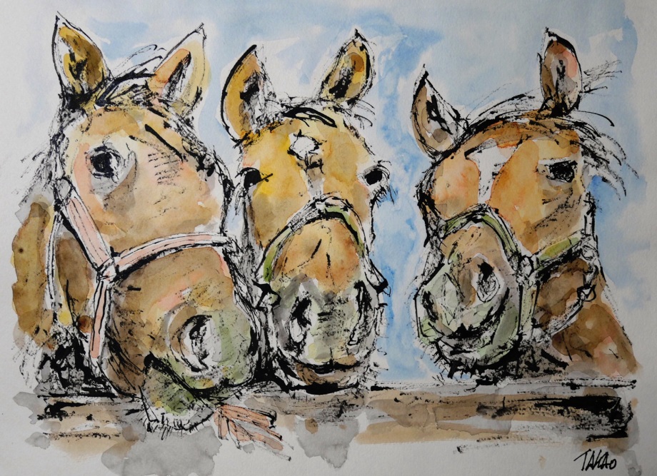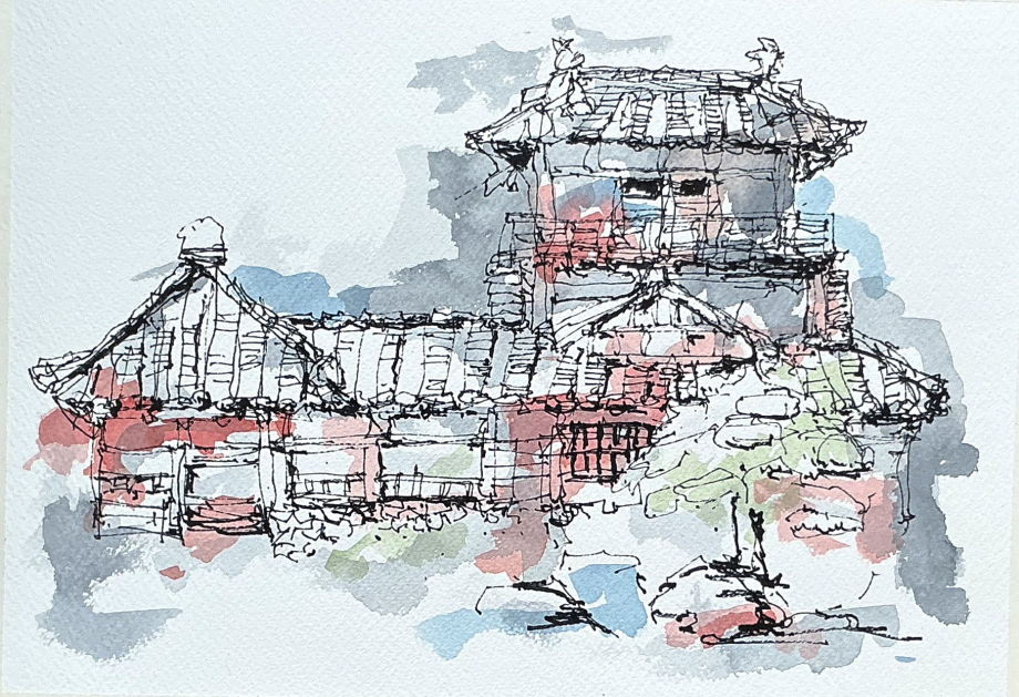 旅先で小さな紙に落書きのようなペン画を描いて色をつけ絵日記のように楽しんでいました。葦ペンに出会ってからは大きな紙に描くことにも挑戦しています。ペン画は色を入れたとたんイメージが変わってしまいがっかりすることも多いです。やはり水彩画の基礎を学んでいないせいでしょうか、難しいです。